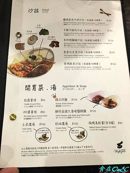 除了厚豬排本身~他搭配了薯條(可沾松露醬)、沙拉與小餐包!