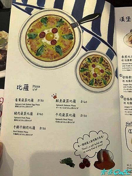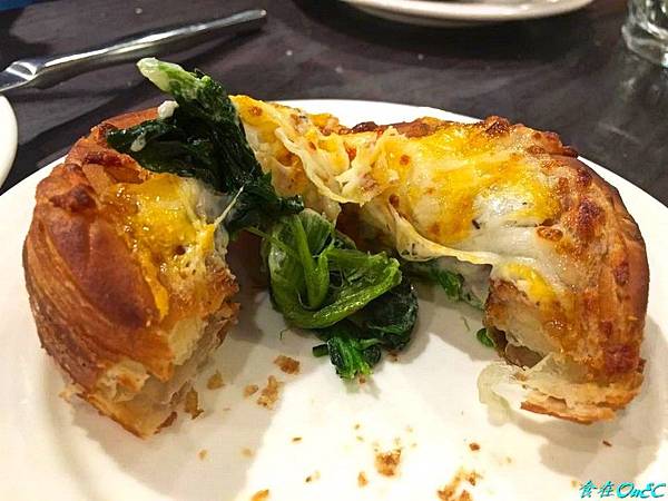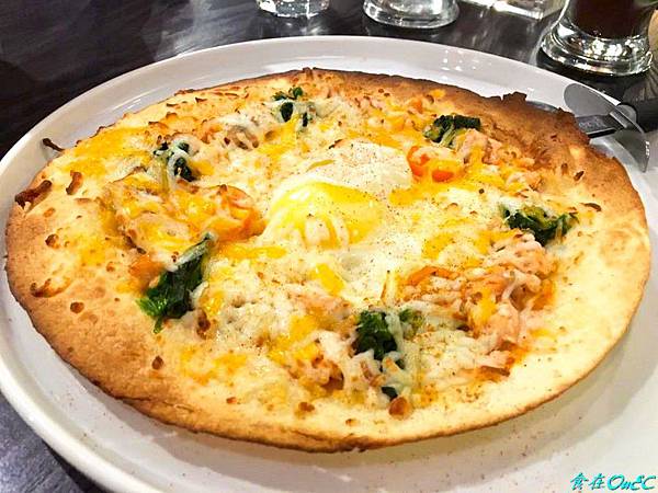 薄脆餅皮搭配鮭魚波菜~鮭魚的味道不會太搶戲~加上菠菜也稍微可以掩蓋魚味