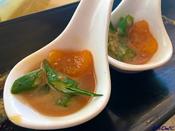 ∮以簡單的胡麻醬搭配微酸的橘瓣與秋葵~雖然簡單但口感相當有層次