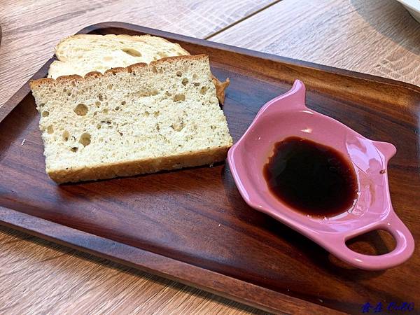 麵包大大小小的氣孔剛好可沾附油醋醬,柔軟的口感越嚼越香!