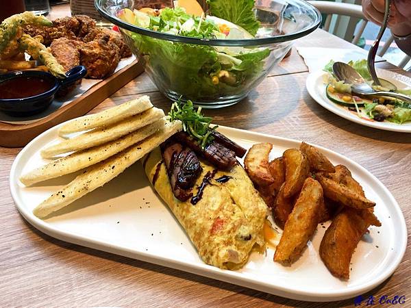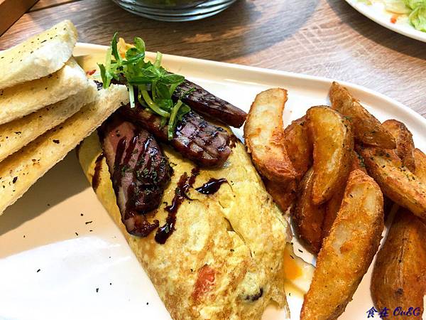 與許多蔬菜丁(杏鮑菇、青紅椒、洋蔥) 融合的蛋汁製造出清爽的歐姆蕾