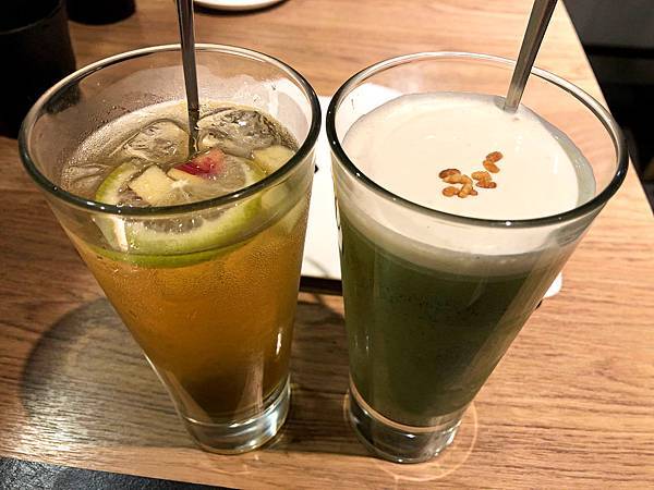 ♨星梨蜜桃冰茶(左)、玄米抹茶奶蓋(右)