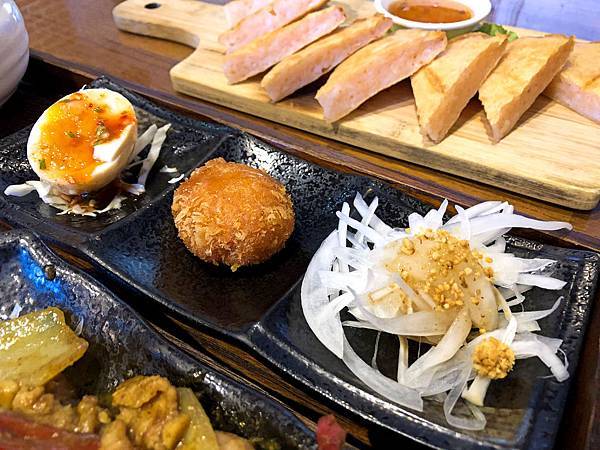 糖心蛋、金錢蝦餅及涼拌洋蔥(由左至右)