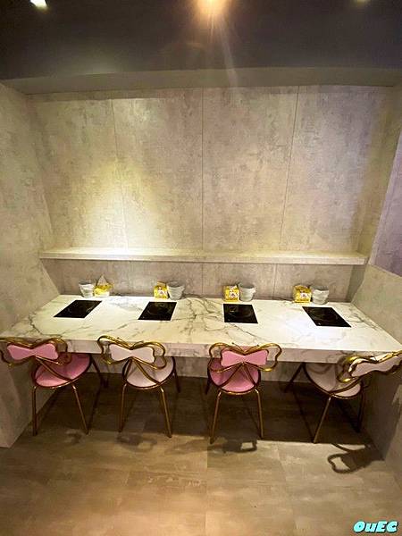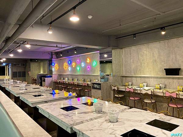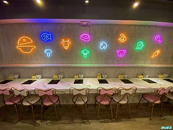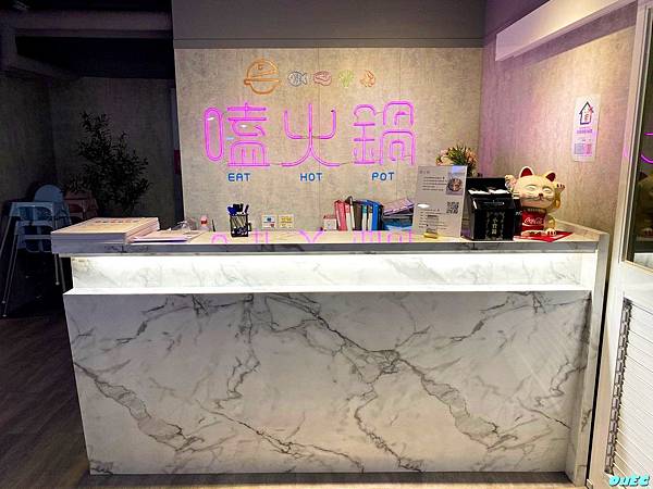 ♨ 可愛大方的櫃檯,LOGO使用粉紅燈飾組合而成。