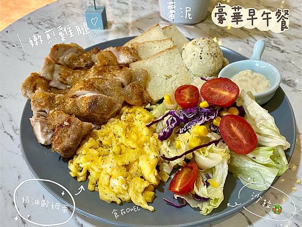 有煎雞腿排、歐姆蛋、沙拉、薯泥還有吐司