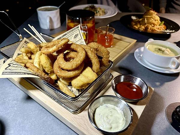 經典炸物拼盤 包含了金黃酥脆的雞塊、洋蔥圈和薯條