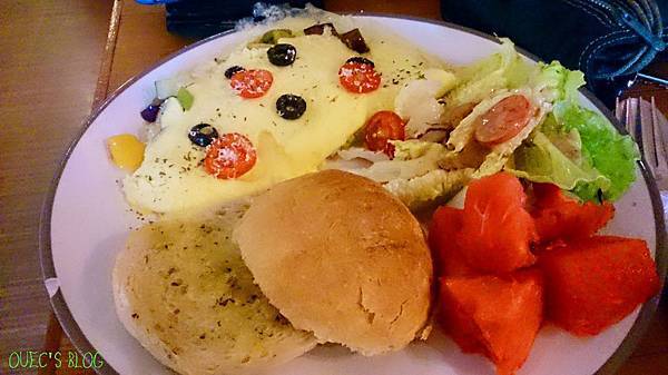 -很多蔬菜的法式蛋捲+時蔬沙拉+水果+鄉村麵包